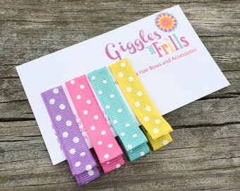 A set of colorful hair ties with polka dots is displayed on a wooden surface. The hair ties are arranged in a row, with each tie having a different color: purple, pink, blue, yellow, and green. The background is a white card with the text 'Giggles Frills' and a decorative sun design. | Polka Dotted Hair Clip Set, Bright Colored Polka Dot Hair Clips, Basic Hair Clips, Girls Hair Clips, Toddler Hair Clips, Summer Hair Clips | 6a8e01218b9e925f45d21e141649120c2c301e04ec8c1268013a8c55c16d112e | 001065772623 | 0 | 0 | 52 | 23 | 0 | 0 | |