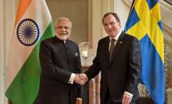 Two men in suits are shaking hands in front of a backdrop featuring the Indian and Swedish flags. The man on the left is wearing a black suit with a green and white striped tie, and the man on the right is wearing a dark suit with a blue tie. They are both wearing white shirts and have their jackets buttoned. The Indian flag is on the left, and the Swedish flag is on the right. There is a lit candle on a small table between them. | India, Sweden to join hands to set up healthcare innovation | 73e3349254b4ca165e36281d72070fc2c2bd5518ca739e263145719f07e602f7 | 001065772682 | 0 | 0 | 87 | 10 | 0 | 0 | |