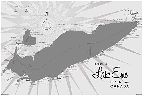 A detailed map of Lake Erie, featuring a grid overlay with latitude and longitude lines, and a compass rose in the upper left corner. The map includes a legend in the bottom right corner, and the title 'BEAUTIFUL LAKE ERIE USA AND CANADA' is prominently displayed at the bottom. | Lake Erie OH Gray Vintage-Style Art Print Lakebound . | 78de435f059f0553b51575ac69fb5f4002883122200cd7e46b46b29cea924880 | 001065772848 | 0 | 0 | 49 | 9 | 0 | 0 | |