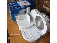 A white electric rice cooker with a lid open, revealing the cooking area, is placed on a wooden surface. The cooker has a control panel with buttons and a digital display. Next to the cooker, there is a blue box with the words 'COOKWAVES' printed on it. The box appears to be a packaging box for the rice cooker. | meat/Food Slicer, cookworks, boxed,never used | 2d24f7ab6d78d45f269d9f2864b527f99188b93afe0cbc0e71dc61677530f84e | 001065773122 | 0 | 0 | 59 | 5 | 0 | 0 | |