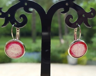 A pair of earrings with a marbled pink and white design is displayed on a black stand. The earrings have a circular shape with a textured surface and are attached to a gold-colored earring hook. The stand has a decorative black swirl design at the top. | Hand painted earrings. | 238b071dc8050992745c523d5905614cb6a0a4003969179595ead624c6056643 | 001065773161 | 0 | 0 | 46 | 3 | 0 | 0 | |