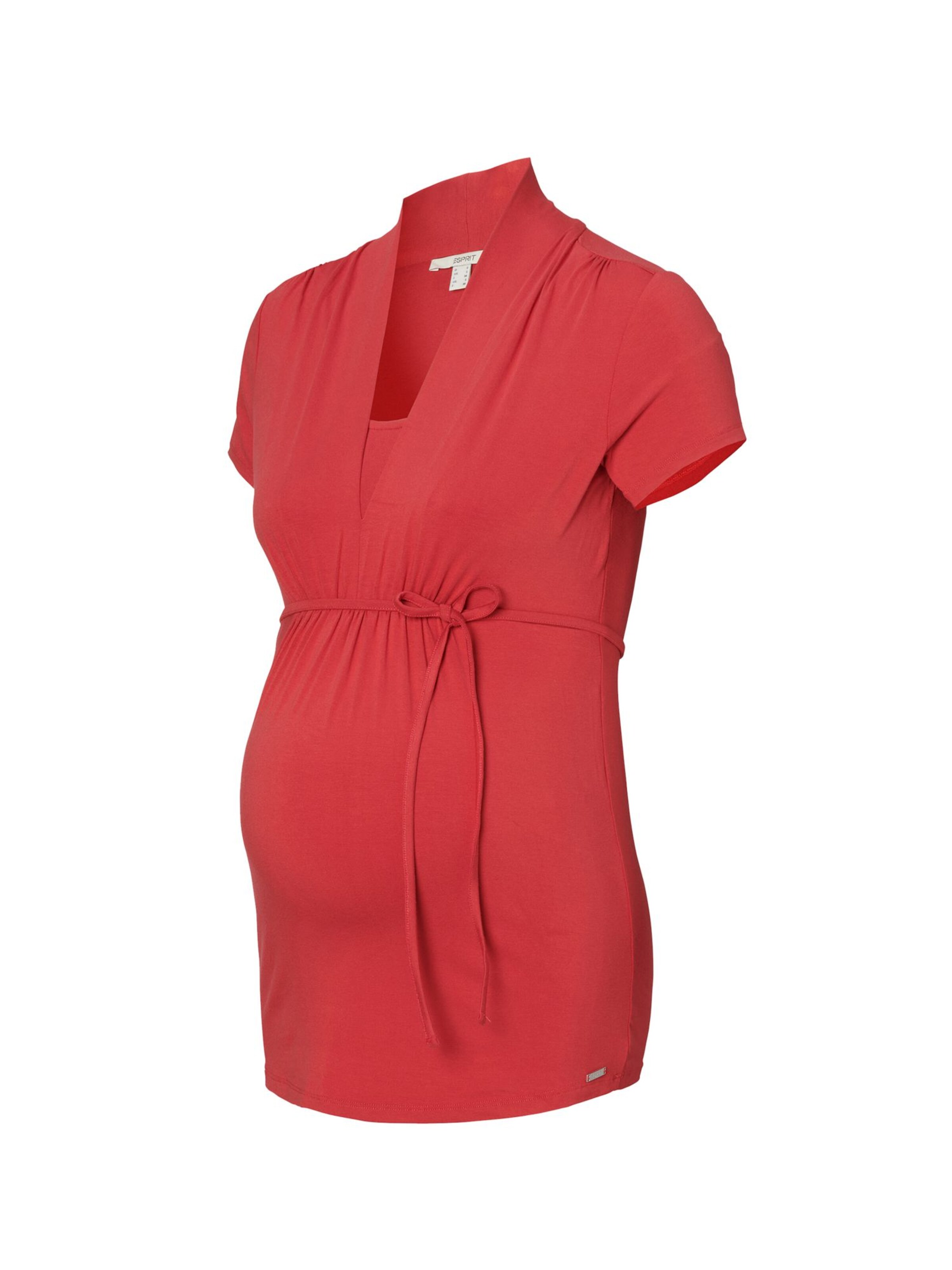 A red maternity top with a V-neckline, short sleeves, and a bow at the front. The top has a relaxed fit and is designed to accommodate a growing belly. It features a white tag on the neckline and is displayed against a white background. | Esprit Maternity T-Shirt in Rot: front | 1179bac7dd2cb1a55bf4cc79c9f9d766a50231a4e225ac7ab5684d3337e05d20 | 001065774652 | 0 | 0 | 44 | 6 | 0 | 0 | |