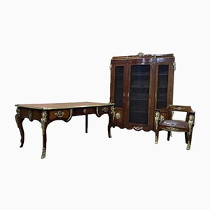 A wooden table with ornate carvings and a matching wooden cabinet with glass doors are displayed against a white background. | Regency Style Desk Set in Amaranth and Rio Rosewood Veneer | df8694890f87299b33547745c494f4631ca9b50e1bf8b8d0ef1ea0e89dc0776f | 001065774769 | 0 | 0 | 20 | 10 | 0 | 0 | |