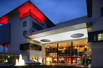 The first image shows a modern building at night with a prominent red light on the top floor. The building has a white facade with a glass entrance that reflects the surrounding lights. In front of the building, there is a fountain with water jets, and a car is parked beside it. The sky is dark with a hint of blue, suggesting it is either dusk or dawn. | Enter your dates to get the best Galway hotel deal | c46e7d3adbe6079edc6db51b07285f68e85d99061df12d2251ad701374ba4b58 | 001065774672 | 0 | 0 | 68 | 10 | 0 | 0 | |