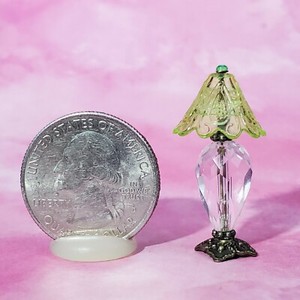 A small, delicate glass figurine of a lamp with a green gemstone on top stands on a white base. The lamp is positioned next to a large silver coin with a portrait of a woman on it. The coin is placed on a pink surface with a soft pink background. | 1:24 DollHouse Miniature Lamp Crystal Living Room Table Light Half Inch Scale | 9f4a6942e80a0ce6b7bc128361bf2da9afb81784b04a43e6cdbe5a01a6d1a6bb | 001065774827 | 0 | 0 | 50 | 12 | 0 | 0 | |