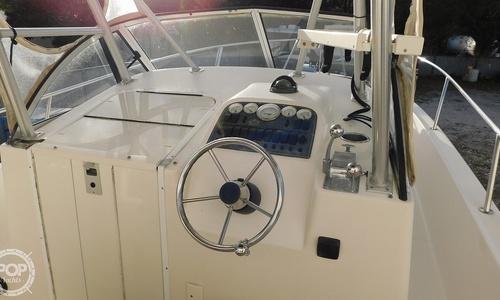The first image shows the interior of a boat's helm station. The steering wheel is in the center, surrounded by various controls and instruments. There is a navigation screen with a blue and white display, and a joystick control to the right of the wheel. The boat's interior is predominantly white, with a metallic finish on the steering wheel and some of the controls. The image is clear and well-lit, with no visible water droplets or reflections on the surface. | Image of Shamrock 246 WA for sale in United States of America for $46,700 (\xc2\xa335,504) Vero Beach, Florida, United States of America | 142b6281310a6194b3f58fb9b23fd70f6726d9ccc7d45f27d6d135786afdefe2 | 001065774895 | 0 | 0 | 80 | 22 | 0 | 0 | |