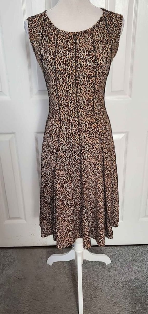 A mannequin is dressed in a brown dress with a leopard print pattern. The dress has a fitted bodice with a flared skirt and a high neckline. It is displayed on a white mannequin stand against a white background with a white door partially visible on the right side. | Vintage Cheetah Print Swing Dress | a4b094fc3e404e2ddc6635e93c458fade9c329b92cc634f3a6fe90ed3e8b538a | 001065774774 | 0 | 0 | 49 | 5 | 0 | 0 | |