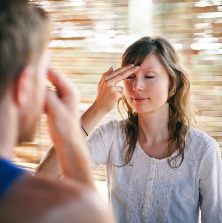 A woman with long hair is performing a self-massage on her neck and shoulder, with her eyes closed and a gentle smile on her face. She is wearing a white blouse with lace details and is standing in a room with wooden walls and a window. | Feeling Anxious? Use These 3 Acupressure Points To Calm Your Nerves, Stat | bbc30b730437892620ccd45a2478eb142b6bcf5bd87444772224d8ebfd4dd95c | 001065774888 | 0 | 0 | 46 | 12 | 0 | 0 | |