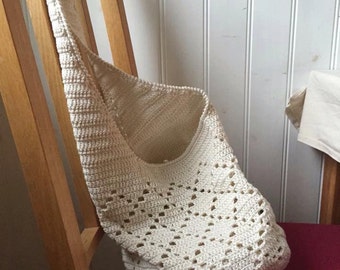 A white knitted handbag with a textured surface and a ribbed design is hanging on a wooden chair. The bag has a round, button-like pattern on its front and a long, curved handle. The chair is positioned against a wall with vertical white panels, and there is a white cloth hanging on the wall to the right of the chair. | Summer Bag Crochet Pattern | 53a9e9577379c472b7551555a91b5dbdc9311158f2b78855e993fb5ac60a8aa6 | 001065775034 | 0 | 0 | 60 | 4 | 0 | 0 | |