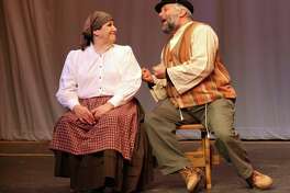 A man and a woman are sitting on a stage, engaged in a conversation. The man is wearing a brown vest, a striped shirt, and a black hat, while the woman is dressed in a white blouse and a brown skirt with a red and white pattern. They are both smiling and appear to be enjoying each other's company. | Jackie Downing and Marc Garofalo rehearse for Fiddler on the Roof at Center Stage Theatre in Shelton. Conn. on Sunday, Jan. 19. 2014. The performance starts on Jan. 31 - Feb 15. | 78f8bf12ca8c1870c5c0c43828bc77e8d081371f285de0ef7092bf293ff6a07a | 001065775019 | 0 | 0 | 59 | 32 | 0 | 0 | |