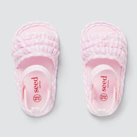 A pair of pink baby shoes with a textured upper and a smooth sole. The shoes have a ribbed design on the upper part and a small logo on the side. The shoes are placed on a white background. | Gingham Frill Sandal PINK hi-res | 0adf0c71b1c784123156ec4da7c033c96439555e28313da7088ffdba1a317337 | 001065774949 | 0 | 0 | 39 | 5 | 0 | 0 | |