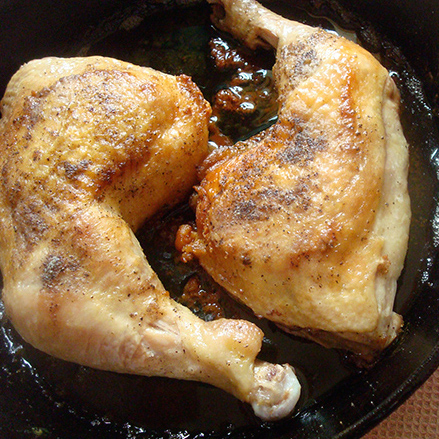 A close-up image of a chicken thigh with crispy skin, seasoned with spices and herbs, cooking in a black skillet with a dark sauce. The chicken is positioned in the center of the frame, with the skillet's edge visible at the bottom. The lighting is warm, highlighting the textures and colors of the chicken and the sauce. | pan fried chicken legs | fd723a2caa3531c456a40503a7c628ca13b9383ba629bda408d86d46b87a747e | 001065775171 | 0 | 0 | 57 | 4 | 0 | 0 | |