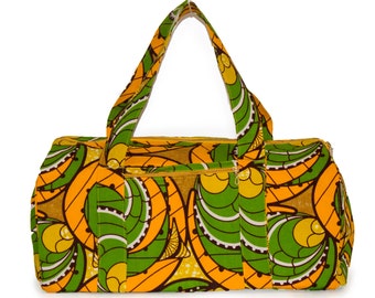 A vibrant, multicolored handbag with a pattern of green, yellow, and orange leaves and a green handle. | Duffle Bag Fair Trade Yellow & Green Carry On Size Travel Bag | 0e1f1b8c490594bd296a14a27e483fa8d9596af04db895f1ba32a54c73a8b605 | 001065775111 | 0 | 0 | 17 | 12 | 0 | 0 | |