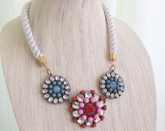 A white mannequin is wearing a necklace with a large turquoise pendant and two smaller pendants, one with a red and pink floral design and the other with a blue and white design. | Rhinestone Flower Bib Necklace | 148036c88745e10d546c996940eec0cdc66b8af4fd9923d0fa7cf4ced458e664 | 001065775389 | 0 | 0 | 33 | 4 | 0 | 0 | |