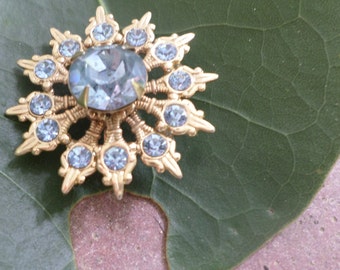 A close-up image of a golden brooch with a large, round, blue gemstone at its center, surrounded by smaller, round, blue gemstones. The brooch is set against a green leaf background, with the leaf's veins visible. The brooch has a detailed, ornate design with intricate patterns and is attached to a surface with a visible shadow. | Vintage Aqua Starburst Brooch Crystals Gold tone | 445ae60ffd78197905fffec4e75f231967551fd96272f2b9f346748e488ffb3a | 001065775463 | 0 | 0 | 56 | 7 | 0 | 0 | |