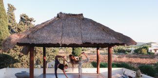 A woman in a black and white striped outfit is performing a yoga pose on a wooden platform under a thatched-roof structure. The structure is surrounded by lush greenery, including trees and bushes, and there is a clear blue sky above. The woman's hair is long and flowing, and she appears to be in a yoga pose with one leg lifted and bent at the knee. | Mind body Retreats Yoga Retreat Ibiza | c23da11e81d26542ff6ec2744ebc8cb9278f944e010780c8ded53caa0ae2732a | 001065775727 | 0 | 0 | 66 | 6 | 0 | 0 | |