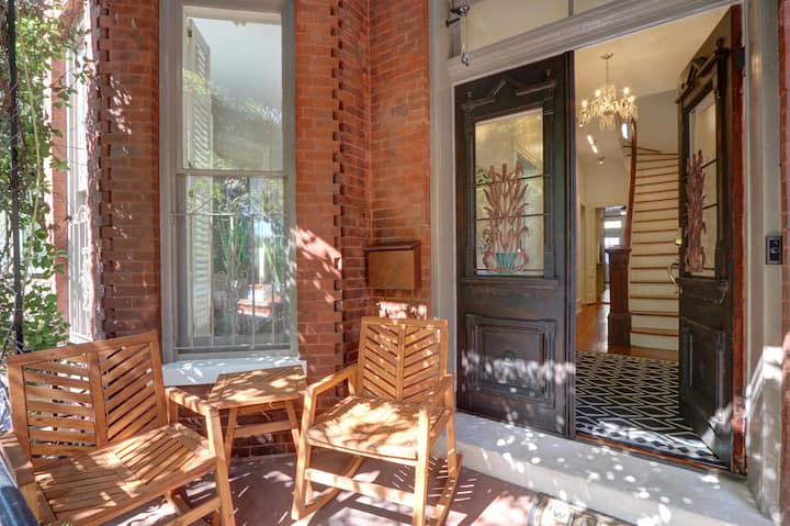 A wooden chair with a woven seat is placed on a red brick porch next to a small round table. The porch is adorned with a patterned rug and a wooden door with a glass window, featuring a stained glass design. The scene is illuminated by natural light, casting shadows on the floor. | NEW - Downtown Victorian-Garage-steps to Broughton | 8dcf361c5d0d73bc6aa1189c0ddce1dd5676d60da6f0a7f009d088adc8209a16 | 001065776082 | 0 | 0 | 53 | 6 | 0 | 0 | |