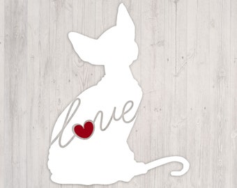 A white silhouette of a cat with a heart-shaped cutout on its back is placed on a wooden surface. The cat is positioned with its head turned to the left and its tail curled to the right. The word 'love' is written in cursive script on the cat's back, with the letters 'l' and 'v' overlapping the heart-shaped cutout. | Sphynx Cat Love: A Car Window Vinyl Decal - Laptop Sticker - Cat Breed Decals - Cat Stickers - Cooler Decal - Gift for Cat Lover | 951bab7ff20308325b434830069d59f0ea919204af4023bdd481fe19ea264fc9 | 001065776271 | 0 | 0 | 59 | 26 | 0 | 0 | |