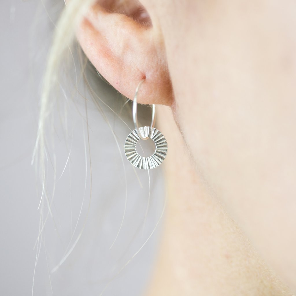 A close-up of a person's ear with a silver hoop earring. The earring has a circular design with a pattern of concentric circles and a small, round, textured element at the center. The person's hair is light-colored and appears to be wavy. | 1919 SILVER HOOP EARRINGS | 6de5ae962c77d493611e55ded6b9192ad6c267cb87647f6b8ddaa6411c39cd94 | 001065776180 | 0 | 0 | 42 | 4 | 0 | 0 | |