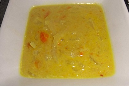 A bowl filled with a yellowish-orange soup containing chopped carrots and onions. The soup appears to be creamy and has a smooth texture. The bowl is placed on a surface with a dark background, and the lighting is soft and diffused, highlighting the colors and textures of the soup. | Chinakohl - Kokos - Curry - Suppe 3 | 42c3863db4399b6518d6e496252d5d83c7ead323ea855382ae2fc82b26234eb6 | 001065776194 | 0 | 0 | 49 | 8 | 0 | 0 | |