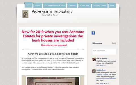 A website page with a header that reads 'ASHMORE ESTATES' and a subheading 'New for 2019: When you rent Ashmore Estates for private investigations the bunk houses are included'. Below this, there is a paragraph of text that starts with 'Ashmore Estates is getting better and better...'. The page also includes a section with a comment box and a 'Leave a comment' button. The website has a clean design with a light blue background and white text. | Screenshot of Home Page hauntedashmoreestates.com - Ashmore Estates - captured Nov. 29, 2018 | 89359471ead0abc360b69d002d9fbb0eeddfa510a3862133bd954b51ed170cf4 | 001065746295 | 0 | 0 | 77 | 13 | 0 | 0 | |