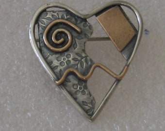 A silver heart-shaped brooch with a floral pattern and a spiral design on the left side is lying on a white surface. | Mixed Metal Heart Brooch | 38ae588ecbe6332fb9214bc6fec303480a2db260e8db37b1002c83744cbc5d7a | 001065746068 | 0 | 0 | 22 | 4 | 0 | 0 | |
