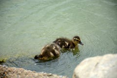 Two ducklings are swimming in a pond with clear water. The ducklings are close to the edge of the pond, and there is a large rock partially submerged in the water. The water is calm, and the ducklings appear to be enjoying their time in the pond. | Ducklings Stock Photography | 547de71b7aab34f2119d0f4083483f49b739a5e7e06bf3f48812f260775b979e | 001065746264 | 0 | 0 | 47 | 3 | 0 | 0 | |