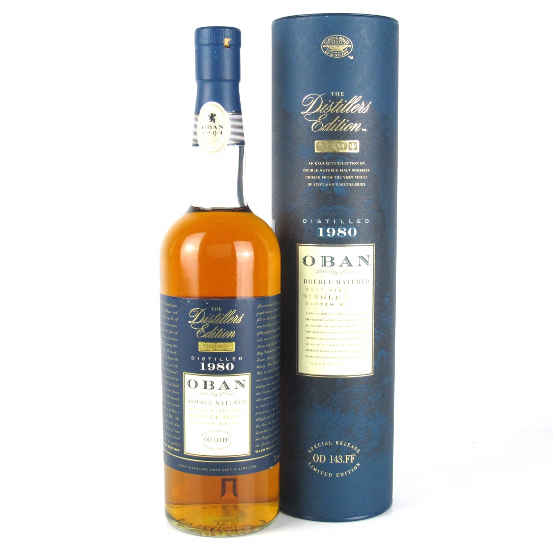 A bottle of Oban Single Malt Scotch Whisky is displayed with its label facing forward. The label features a blue background with gold and white text and a decorative border. The bottle is placed on a white surface, and the label is partially obscured by the bottle's neck. | Oban 1980 Distiller's Edition | 7604cd5fad1ae55aa9e3a6c9cfbfa080919ad2f3b0732c47d2153e99f6589bbd | 001065746176 | 0 | 0 | 48 | 4 | 0 | 0 | |