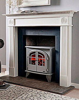 A modern living room with a white fireplace mantel and a blue fireplace with a lit fire. The mantel is adorned with a framed picture, a vase with dried flowers, and a stack of books. The fireplace is surrounded by white columns and a white hearth. The floor is covered with a patterned rug, and there is a black and white patterned rug in front of the fireplace. A black armchair is visible to the left of the fireplace. | Warmlite 2000W Log Effect Grey Stove | 1181993b102ff0a6eb194ae7a8280badd796eb656927853a8380cd992a2bf291 | 001065747002 | 0 | 0 | 79 | 6 | 0 | 0 | |