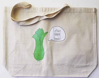 A beige canvas tote bag with a cartoon image of a green cucumber with a speech bubble saying 'Letuce (sic) be friends!' on the front. The bag has a long strap and is hanging against a white background. | Lettuce Romaine Friends + heavy duty reusable canvas grocery shopping tote bag + 20"x15" with 5" gusset | 60ed13b4466580872ef29adc7737a315600faa4e9918792eefb0bc1a367c4a2b | 001065746909 | 0 | 0 | 38 | 17 | 0 | 0 | |