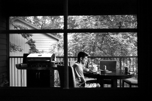 A man is sitting at a dining table on a balcony, looking out at the view. The balcony has a railing and is equipped with a grill and a small table with a cup and a glass. The man is wearing a white shirt and shorts, and there is a chair next to him. The view outside shows a house and trees. | Lake Ozark, Missouri, USA. 2015. Todd Nicely making a phone call at home, in Lake Ozark. | 0d6df64c049233562c6765a4707722d245d37596a2343b09374b4fbee534e9f7 | 001065747171 | 0 | 0 | 62 | 16 | 0 | 0 | |