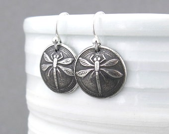 A pair of silver earrings with a detailed dragonfly design on each earring, resting on a white ceramic surface. | Dragonfly Earrings Tiny Silver Earrings Silver Dangle Earrings Bug Jewelry Insect Jewelry Dragonfly Jewelry Handmade Jewelry Gift for Her | e20df231c6bf2384afb20e3de2e5cf825513af02eef95b92e3e8fcb1b431a99b | 001065747228 | 0 | 0 | 19 | 19 | 0 | 0 | |