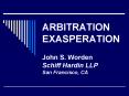 The first image displays a title page with the text 'ARBITRATION EXPARATION' in a stylized font. Below the title, there is a nameplate with the name 'John S. Worden' followed by 'Schiff Hardin LLP' and the address 'San Francisco, CA'. The background is a solid blue color, and the text is white. | ARBITRATION EXASPERATION John S. Worden Schiff Hardin LLP San Francisco, CA PowerPoint PPT Presentation | d1cbf8872d8015a084fbc79b3f24d7e50a1acb3f1e74c7eaed901856f7087f15 | 001065747208 | 0 | 0 | 52 | 14 | 0 | 0 | |