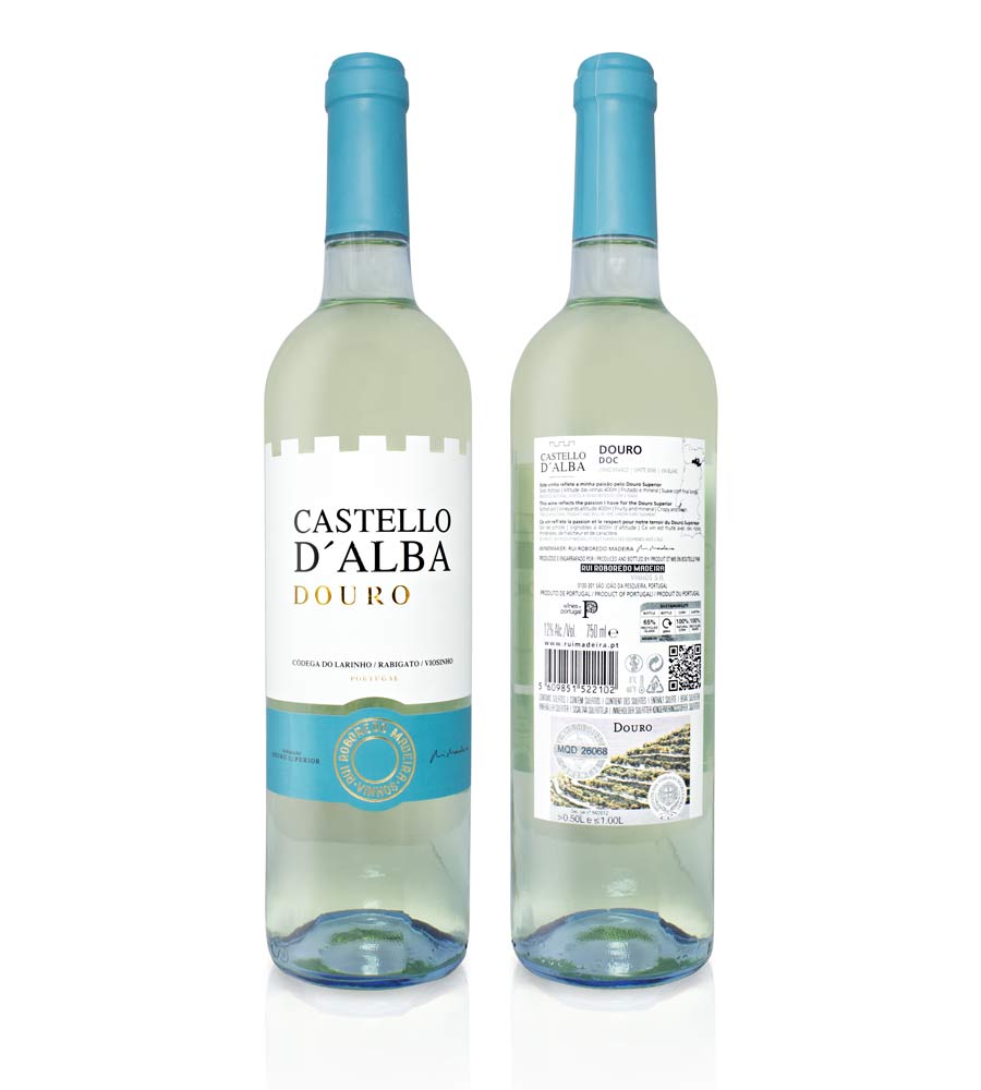 Two bottles of Castello di Albareto Duro wine are displayed side by side against a white background. Each bottle has a blue label with white text and a barcode. The bottles are filled with a clear liquid, presumably the wine, and the labels are partially obscured by the liquid. | Vinho Branco Castello D\xe2\x80\x99Alba Colheita 2018, 75cl Douro DOC | 8eb3203183bc5e42bff850e3c417817f97ca9e73c53ee896efd859a188b39134 | 001065747108 | 0 | 0 | 49 | 9 | 0 | 0 | |