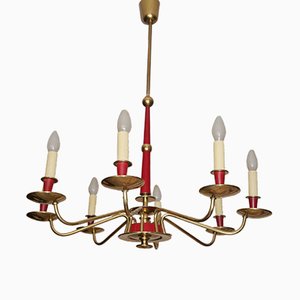 A classic chandelier with a red and gold color scheme, featuring multiple candle-like lights with white shades and red candlesticks. The chandelier has a curved, ornate design with a central column and multiple arms extending outwards. | German Chandelier in Brass & Red Bakelite, 1950s | 9f0019005c544a6e9b70fd0df7d87d04f656dd3ec88bb83db2baae0f2a6e9b37 | 001065747405 | 0 | 0 | 36 | 8 | 0 | 0 | |