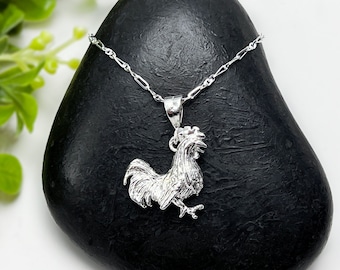 A silver necklace with a detailed rooster pendant is draped over a black stone. The rooster is intricately designed with feathers and a head, and the pendant is attached to a chain that hangs down the stone. The stone has a textured surface and is placed on a surface with a blurred green background, possibly foliage. | Sterling Silver Girls .8mm Box Chain Side Facing Rooster Chicken Weather Vane Pendant Necklace | 0a725010616f04dc126537bda9faeb315cbd6e2080bc85a0b7700bc88d48b3d0 | 001065747270 | 0 | 0 | 56 | 14 | 0 | 0 | |