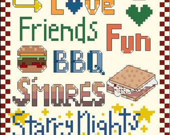 The second image is a pixel art version of the first, with the text and images stylized to resemble a retro video game. The text is composed of blocky, 8-bit style letters, and the images of the hamburger, hot dog, and marshmallow are also rendered in a pixelated manner. The background is a simple, solid color, and the overall design has a nostalgic, pixelated aesthetic. | PDF PATTERN - Family Words - Counted Cross Stitch | 9cb6c002695fec48ca711568c20839758e6c2e362ccd28953e025a9982d66345 | 001065747075 | 0 | 0 | 65 | 9 | 0 | 0 | |