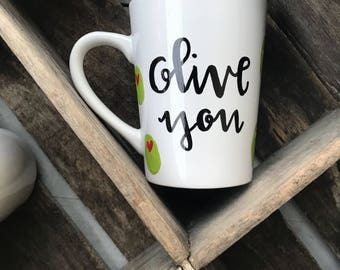 A white coffee mug with a green rim and a black handle is placed on a wooden surface. The mug has a black and white design with the words 'OLIVE YOU' written in cursive script. There are three green heart-shaped designs on the mug, one above the word 'Olive' and two below the word 'You'. | Olive You Coffee Mug, Funny Mug, Gift for Him, Gift for Her, Olive Art, Valentine's Day Mug, Hand Lettered Mug, Kitchen Humor, Novelty Mug | 5530de937eeb842ace1a386f557d2137388d3095982651ef3a4b7c03d5381550 | 001065747340 | 0 | 0 | 55 | 24 | 0 | 0 | |
