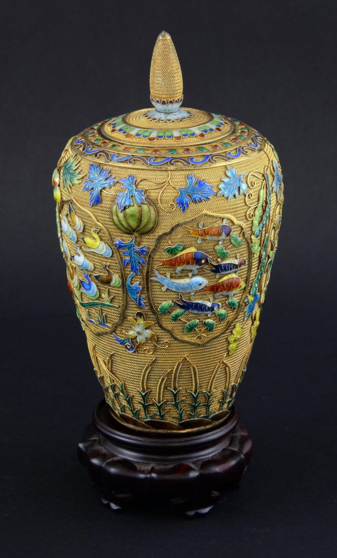 A traditional Chinese vase with intricate blue and gold designs, featuring fish and floral motifs, is displayed on a wooden stand against a dark background. | Modern Chinese silver gilt and overlaid enamel vase and - 3 | 06e654384cae172448c3dc99f403de7224f890f49899a4413a246a41f0c80258 | 001065747336 | 0 | 0 | 25 | 11 | 0 | 0 | |