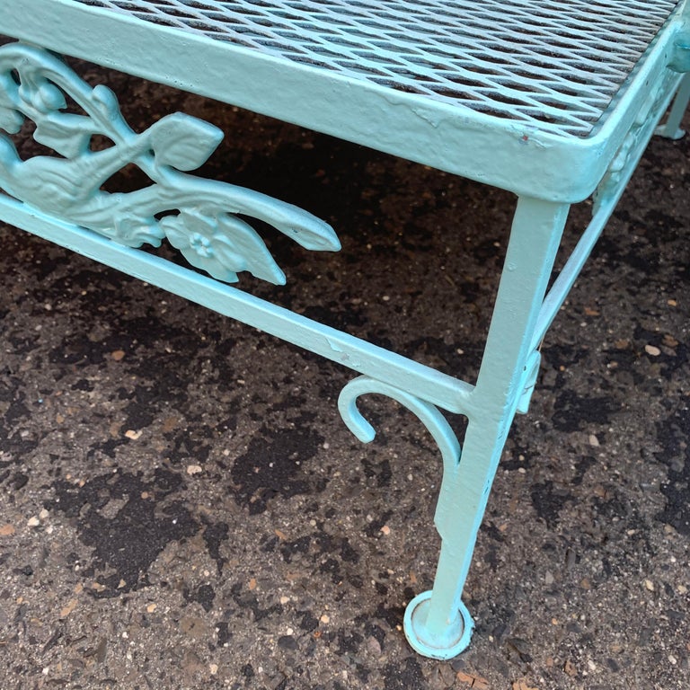 A turquoise metal bench with intricate floral designs on the legs and a curved armrest is placed on a textured surface. | Victorian Set of Turquoise Painted Iron Garden Table, Sofa, Chaise and Armchair For Sale 13 | 2e0754edf2f550e44b3c7cf501aadfc376f1f298f6ee5a30a21e14f4b69be01b | 001065747542 | 0 | 0 | 21 | 15 | 0 | 0 | |