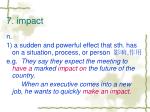 A page from a book with a heading that reads '7. Impact' in a foreign script. Below the heading, there is a paragraph of text in a foreign script, with a translation provided in English. The translation reads: '1. A sudden and powerful effect that 5th has on a situation, process, or person. (E.g. They say they expect a marked impact on the future of the country.) When an executive comes into a new job, he wants to quickly make an impact.' The text is accompanied by a green and blue background with a leaf pattern. | 7 impact | 5db876b67029ef7c4c9be8ddacd1ed359b10af4494a15fd4b90a8d46a8fbe4b1 | 001065747458 | 0 | 0 | 96 | 2 | 0 | 0 | |