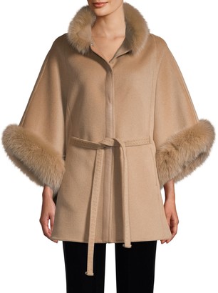 A woman is wearing a beige coat with a fur-lined hood and a fur-lined collar. | Wolfie Fur Made For Generation Fox Fur-Trim Wool & Cashmere Cape | c557ead02637e0c8402e666f02a1c059a6489968b163dd0edb6cc6984ad8dce2 | 001065747460 | 0 | 0 | 15 | 11 | 0 | 0 | |