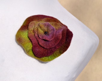 A close-up image of a single, colorful rose with a green stem and leaves, placed on a white surface. The rose has a gradient of colors, starting with a green base, transitioning to a purple center, and then to a pinkish hue towards the edges. The petals are slightly ruffled, and the rose has a small, dark center. | Felt flower, brooch, flower, beads, purple, green | 8713315fb19e5df9772e91706a900c384650f5fa7d3ccfec3b0467e389a4152c | 001065747411 | 0 | 0 | 58 | 7 | 0 | 0 | |