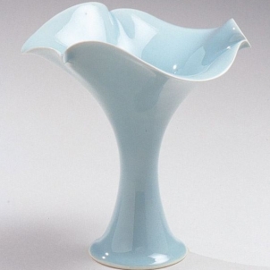 A blue ceramic vase with a smooth, glossy finish and a unique, curved shape is displayed against a white background. The vase has a wide, flared opening at the top and a narrow, elongated neck that tapers down to a rounded base. The color is a vibrant blue with a slight gradient towards the bottom, where it appears slightly lighter. | Kawase Shinobu: The Serene Beauty of Celadon | cccd0766fb8ff8d85ec7b15394c425618247719662dc94a45c07854984b9698b | 001065747546 | 0 | 0 | 60 | 7 | 0 | 0 |