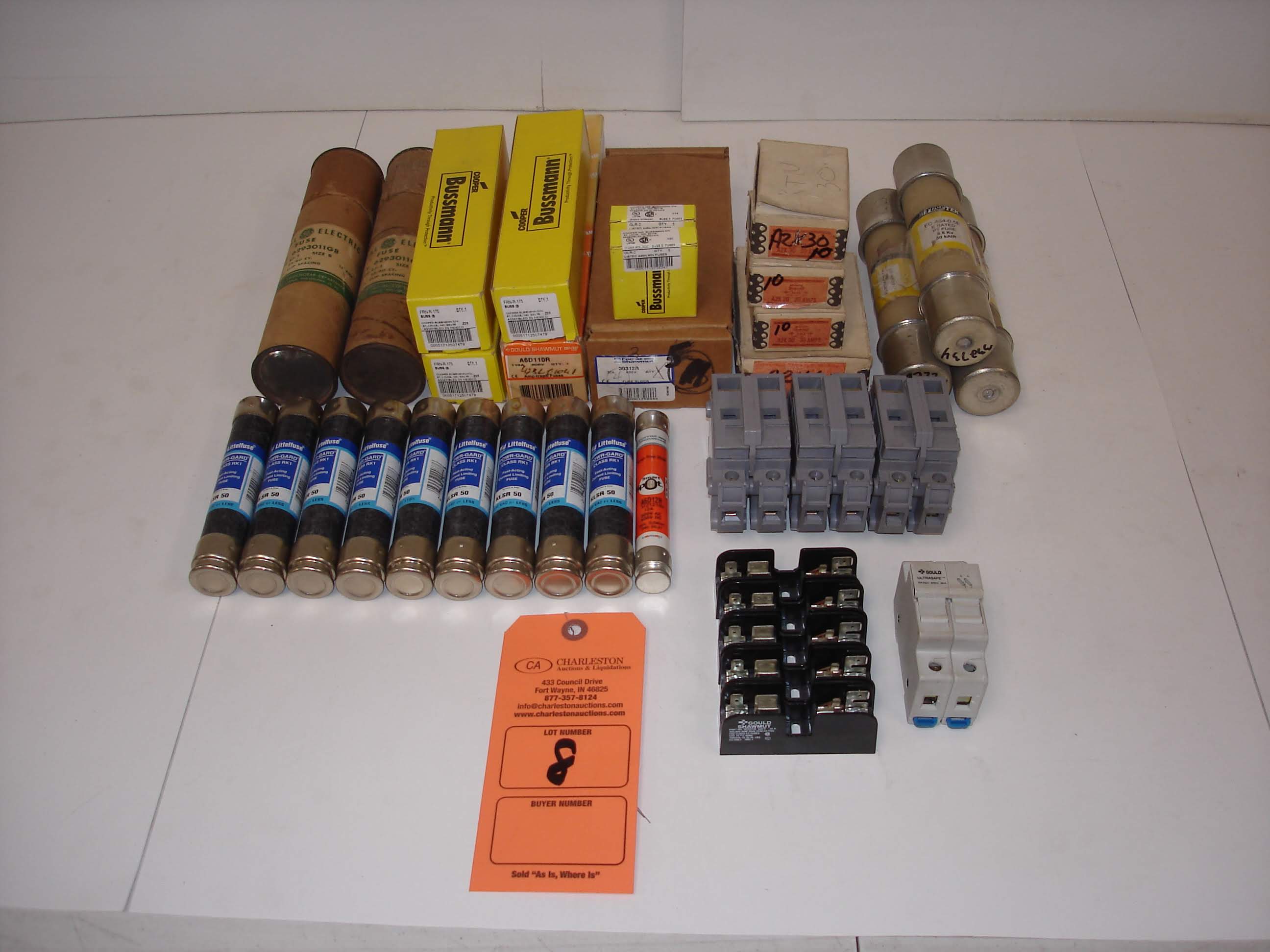 A collection of various electronic components is neatly arranged on a white surface. The components include a mix of resistors, capacitors, and other electronic parts, all with their respective labels and barcodes. There are also several boxes of different sizes, some with labels and barcodes, and a few loose items like a screwdriver and a small tool. A prominent orange tag with a barcode is placed in the center of the arrangement, possibly indicating the contents of the boxes or the purpose of the collection. | Lot 8 - (50+) MISC BRANDED FUSES AND MORE: BUSSMANN FRN-R-175 AND ALL OTHER ITEMS INCLUDED IN PHOTOS! | 9e4039df68674652c890f7533ea2d475a0c8c3bc2c019f8239f02ccd7bc252b1 | 001065747717 | 0 | 0 | 85 | 18 | 0 | 0 | |