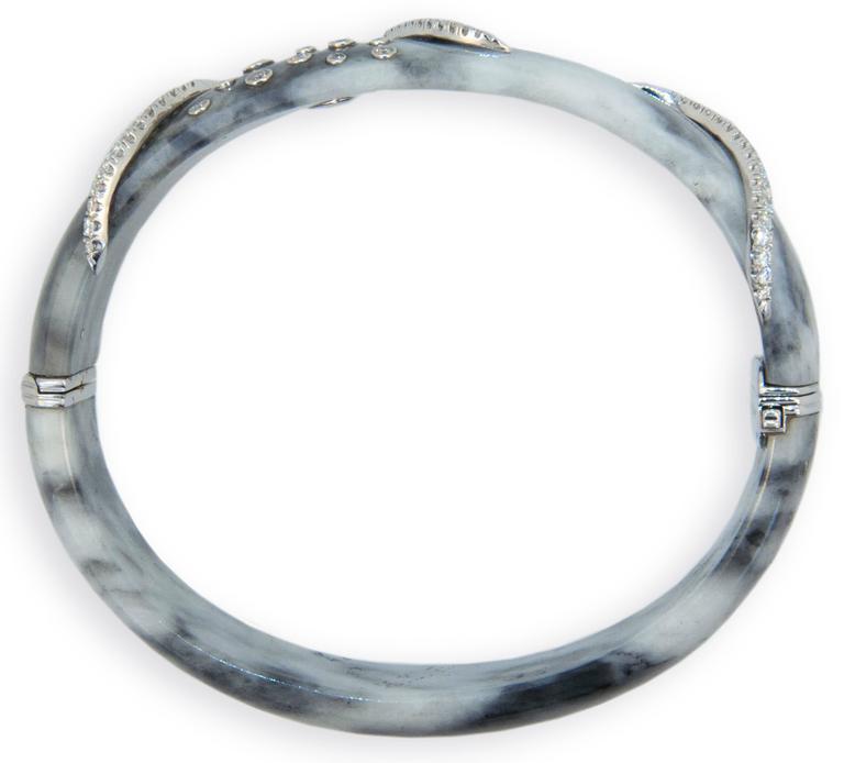 A close-up image of a silver ring with a textured surface and a diamond accent on the band. The ring is positioned against a white background, and the lighting highlights the ring's details. | Laura Munder Zebra Jade Diamond White Gold Bangle Bracelet 3 | 26b98cef21757eb6c366e7ff6b088f3d3f633cef883eab3fee80c76f709e2472 | 001065747871 | 0 | 0 | 33 | 10 | 0 | 0 | |