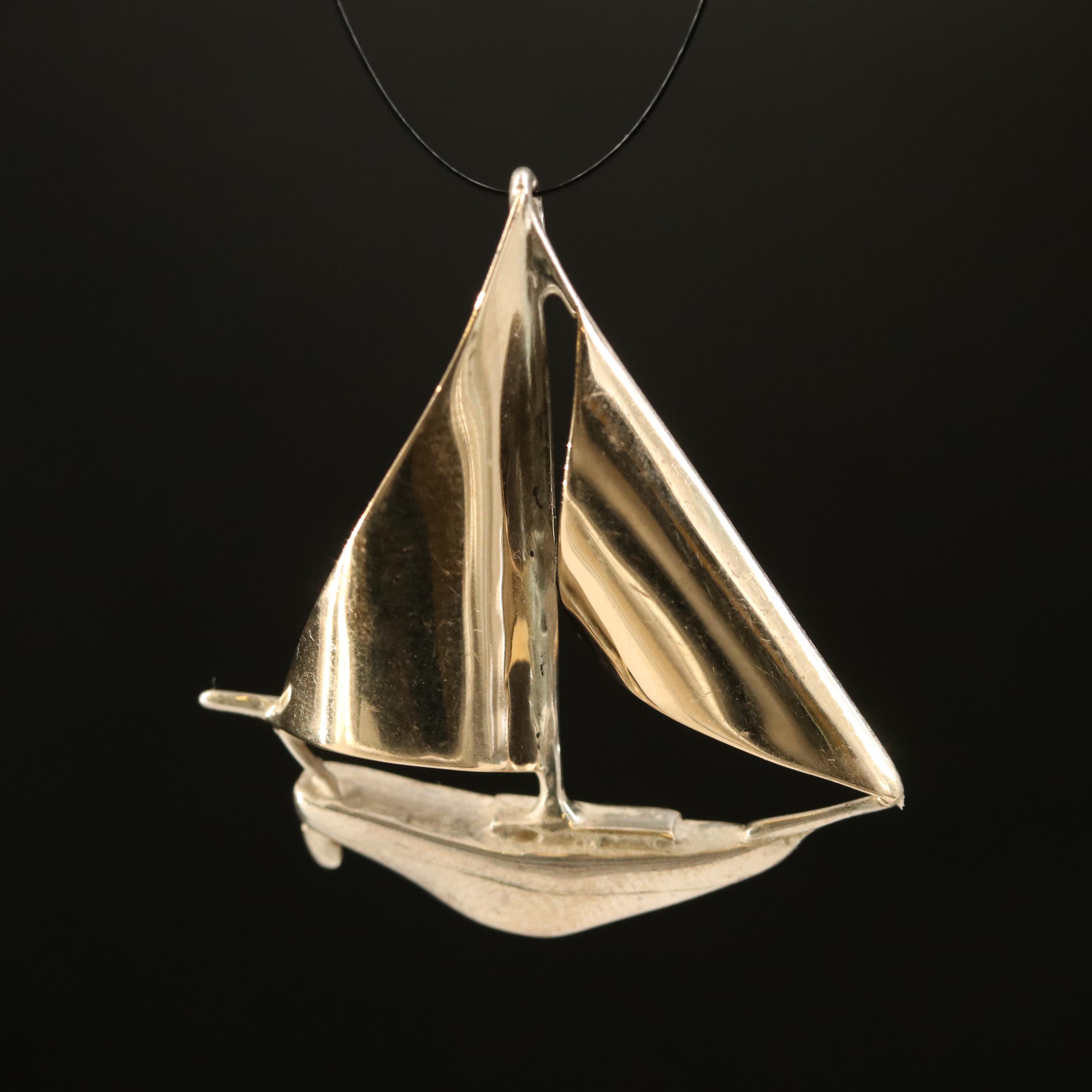 A silver sailboat with a shiny metallic finish is hanging from a black cord against a dark background. | Sterling and 14K Sailboat Pendant | 017f5974ca382a05d6f510c1f241fc387edf4d302631bfe185c81d55f240ce57 | 001065747937 | 0 | 0 | 18 | 5 | 0 | 0 | |