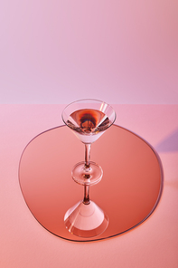A clear glass with a small amount of red liquid is placed on a reflective surface with a pink background. The glass has a curved bowl and a long stem, and the liquid inside appears to be a dark red wine. The reflection of the glass and the background is visible on the surface. | cocktail glass with liquid on mirror with reflection | a48badfa1fdec95c8507911c6f4045db7c96690c5bd19db091da683c478bda84 | 001065747839 | 0 | 0 | 54 | 8 | 0 | 0 | |