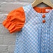 A blue and white checkered shirt with a white collar and orange cuffs is displayed on a wooden hanger against a brick wall. | handmade girls dress / orange plaid sherbet geometric summer Audrey (made to order) | 1d888e2710c890ce05249096b1882bcd800b070913d7a5e2c5090a752a24b314 | 001065747852 | 0 | 0 | 23 | 13 | 0 | 0 | |