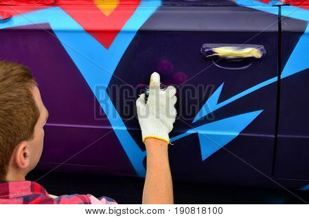 A person is spray painting a car with a vibrant purple and blue design. The person is wearing a white glove on their right hand and is holding a spray paint can. The car's door is open, and the paint is visible on the door's surface. The person is wearing a plaid shirt and has short hair. | A Young Red-haired Graffiti Artist Paints A New Colorful Graffiti On The Car. Photo Of The Process O | 5000305bdcb57d904ed83a6f41958cbd060ae4de5c9fadbaf3fb35ed437a7834 | 001065747850 | 0 | 0 | 57 | 18 | 0 | 0 | |